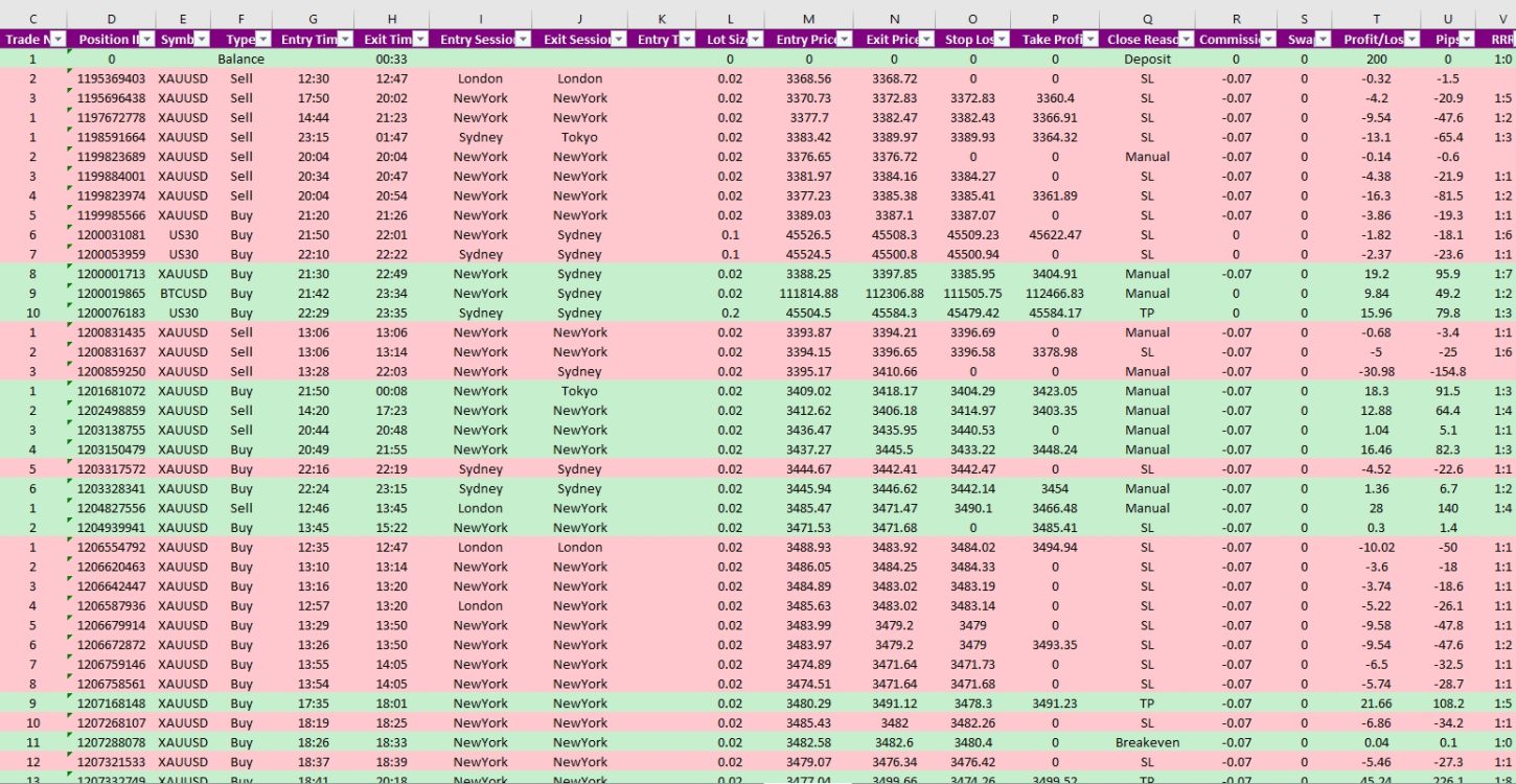 - Date, Ticket/Position ID, Symbol, Side, Lot, Entry/Exit time & price, SL/TP, Close reason