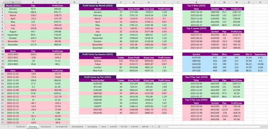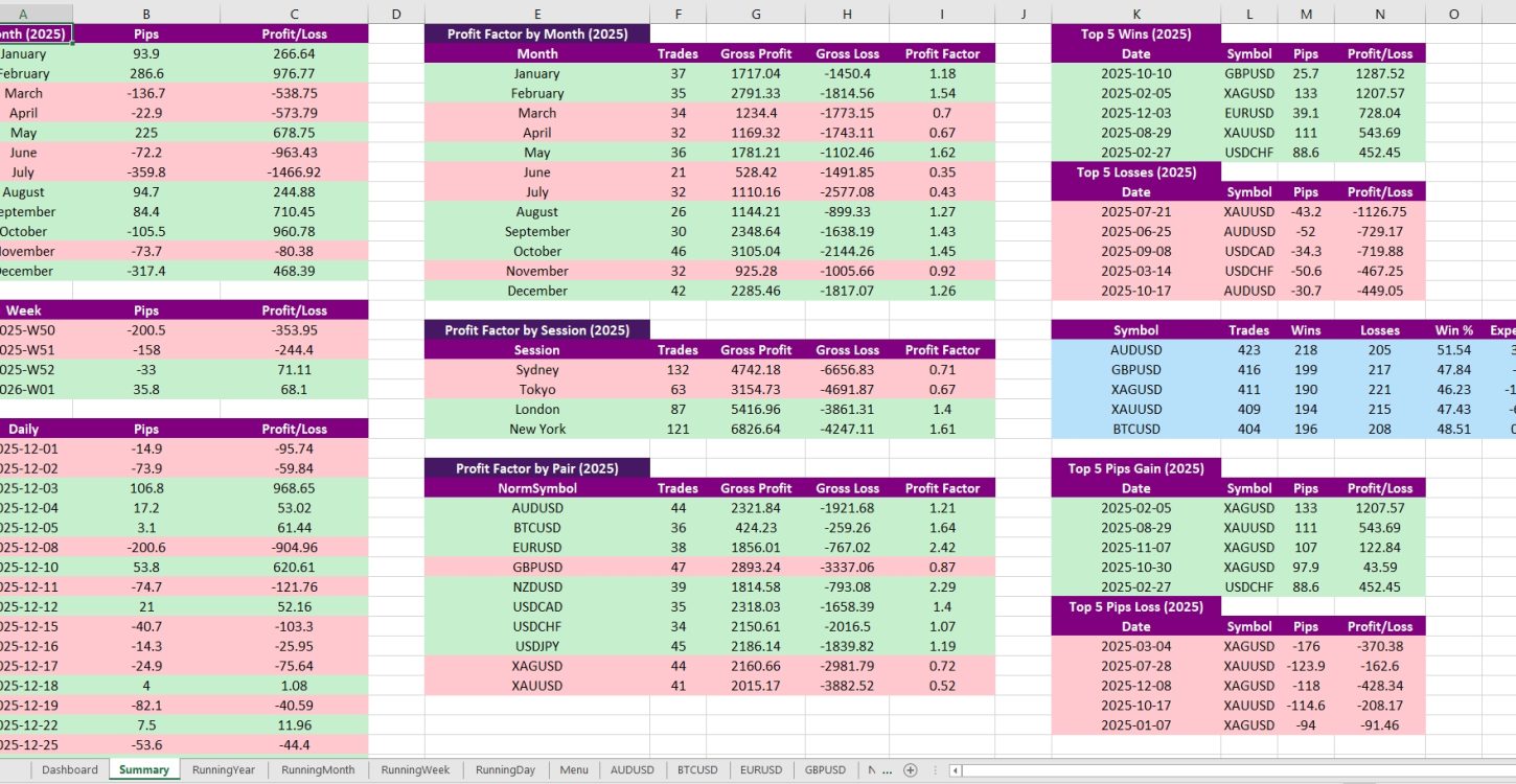 - Fees: Commission, Swap → net Profit/Loss (and pips)